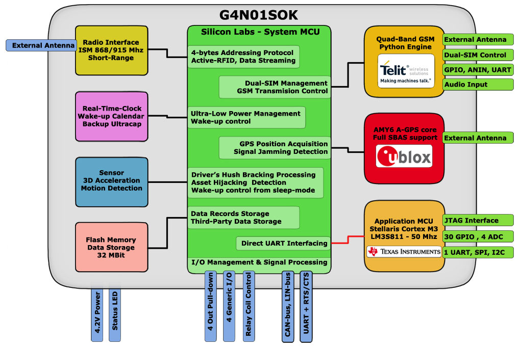 G4N01SOK is a cost effective automotive qualified Multi-component integrated circuits ( MCO ) that allows creating secure, tamper-resistant end-to-end solutions. It is a single system-in-package combining: GSM-GPRS, AGPS, Power Management, RTC, System Memory, In-Car Network functionality (CAN, LIN, JBus), a System MCU with embedded RTOS and a dedicated Application MCU from Texas Instruments for 3rd party coding.